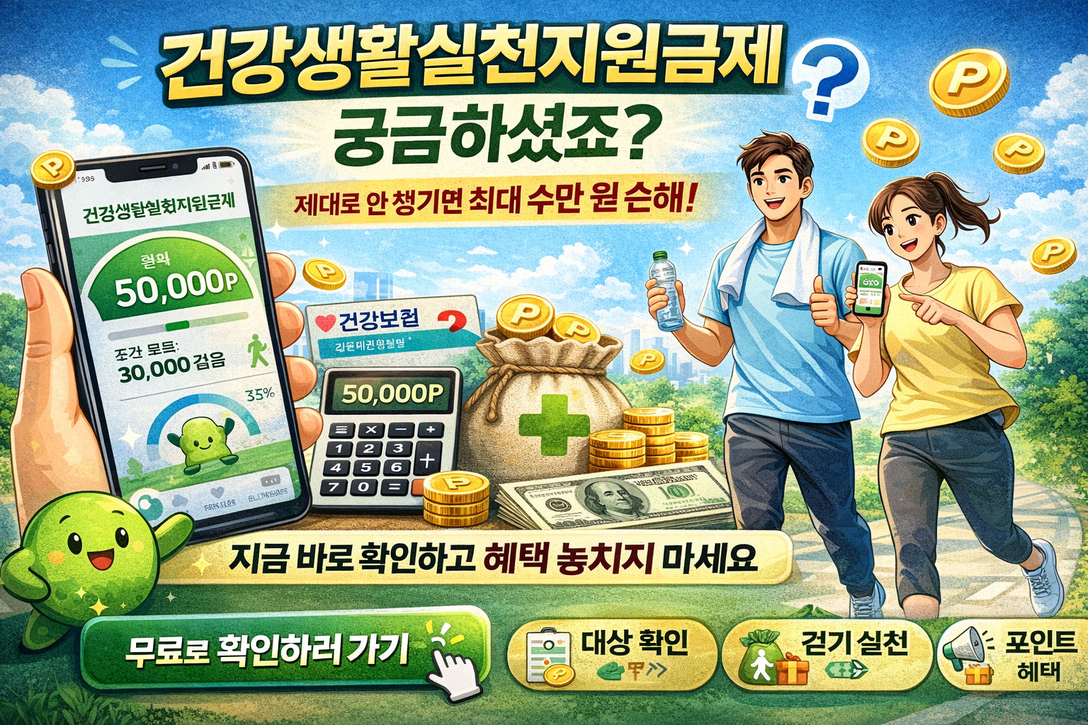 “건강생활실천지원금제 궁금하셨죠?”건강생활실천지원금제에 대해 제대로 모르고 지나치면, 최대 수만 원 이상 손해를 볼 수 있다는 사실, 알고 계셨나요?특히 “나는 해당 안 될 거야”라고 생각하고 넘겼다가, 대상자임에도 신청·연동을 놓쳐 포인트를 못 받는 경우가 정말 많습니다. 이 글에서 핵심만 빠르게 정리해드릴게요.건강생활실천지원금제, 제대로 안 챙기면 최대 수만 원 손해!지금 바로 확인하고 혜택 놓치지 마세요무료로 확인하러 가기 건강생활실천지원금제란 무엇인가요?건강생활실천지원금제는 걷기, 교육·상담, 자가측정 같은 건강생활 실천을 하면 포인트를 적립해주는 제도(시범사업)입니다.많은 분들이 “이런 건 특정 사람만 받는 거 아니야?”라는 오해 때문에 그냥 지나치는데요.대상자라면 앱/홈페이지에서 간단히 신청..