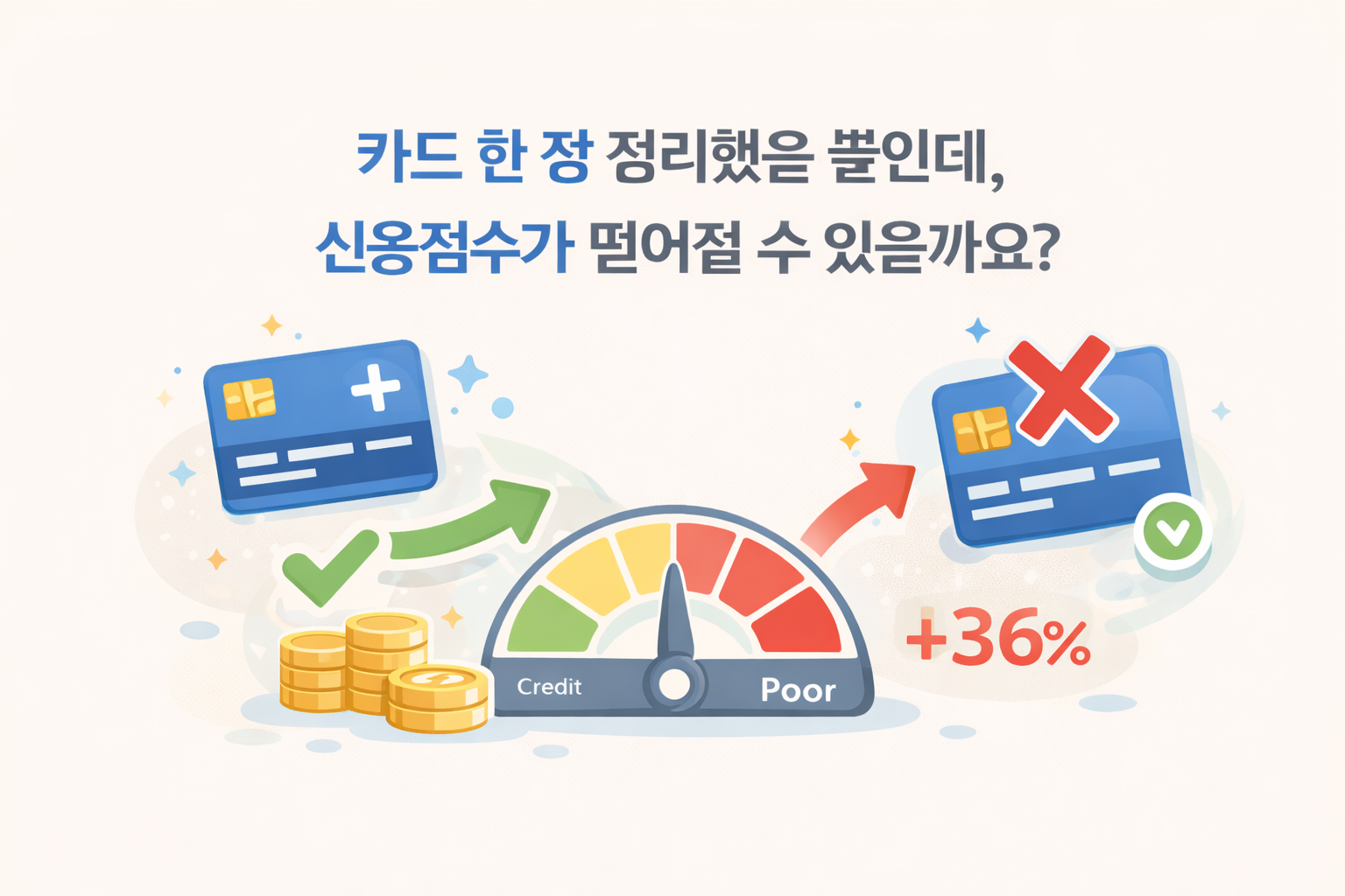 “카드 한 장 정리했을 뿐인데, 신용점수가 떨어질 수 있을까요?”연회비가 부담되거나 거의 쓰지 않는 신용카드를 해지하는 것은 합리적인 소비 관리처럼 보입니다. 하지만 실제 신용평가 구조를 보면 카드 해지는 상황에 따라 신용점수에 불리하게 작용할 수 있습니다.중요한 점은 ‘카드를 해지했느냐’가 아니라, 해지로 인해 신용 구조가 어떻게 변했느냐입니다. 이 글에서는 신용평가사와 공공 금융기관의 설명을 바탕으로 카드 해지와 신용점수의 관계를 정리합니다.신용점수는 떨어진 뒤에 확인하면 늦습니다지금 바로 내 점수 상태부터 확인하세요 무료로 확인하러 가기 결론부터 말하면: 카드 해지는 경우에 따라 신용점수를 떨어뜨릴 수 있습니다미국과 한국의 신용평가 기준을 종합하면, 카드 해지 자체가 즉각적인 점수 하락을 만들지는..