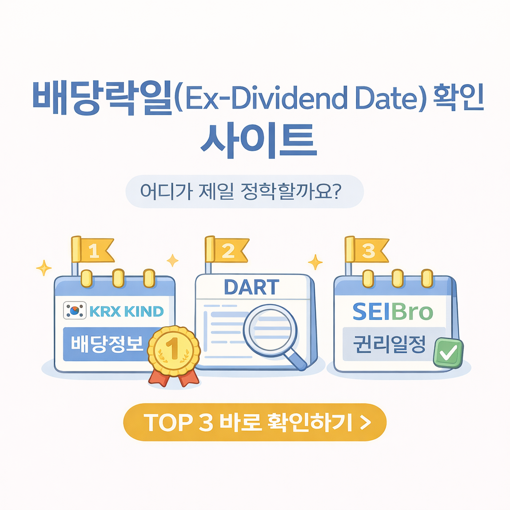 “배당락일(Ex-Dividend Date) 확인 사이트, 어디가 제일 정확할까요?”배당을 노리고 매수했는데 배당을 못 받는 경우는 대부분 배당락일/배당기준일을 잘못 확인했을 때 발생합니다. 특히 연말·분기배당 시즌에는 종목마다 공시 타이밍이 달라서, 포털 검색만 믿고 들어가면 하루 차이로 배당이 날아가거나, 배당락일 이후 매수로 주가 하락만 맞는 상황도 생깁니다.그래서 배당락일은 “어디서 봤다”가 아니라 공식 공시 기반으로 확인하는 루틴이 필요합니다. 아래 TOP 3는 실제 투자자들이 가장 많이 쓰는 공신력·정확도 중심 사이트입니다.배당 타이밍 하나로 수익과 손해가 갈립니다배당락일 확인 사이트 TOP 3부터 정확히 확인하세요 지금 바로 확인하기 배당락일 확인 사이트 TOP 3아래 3곳은 “추정”이 아..