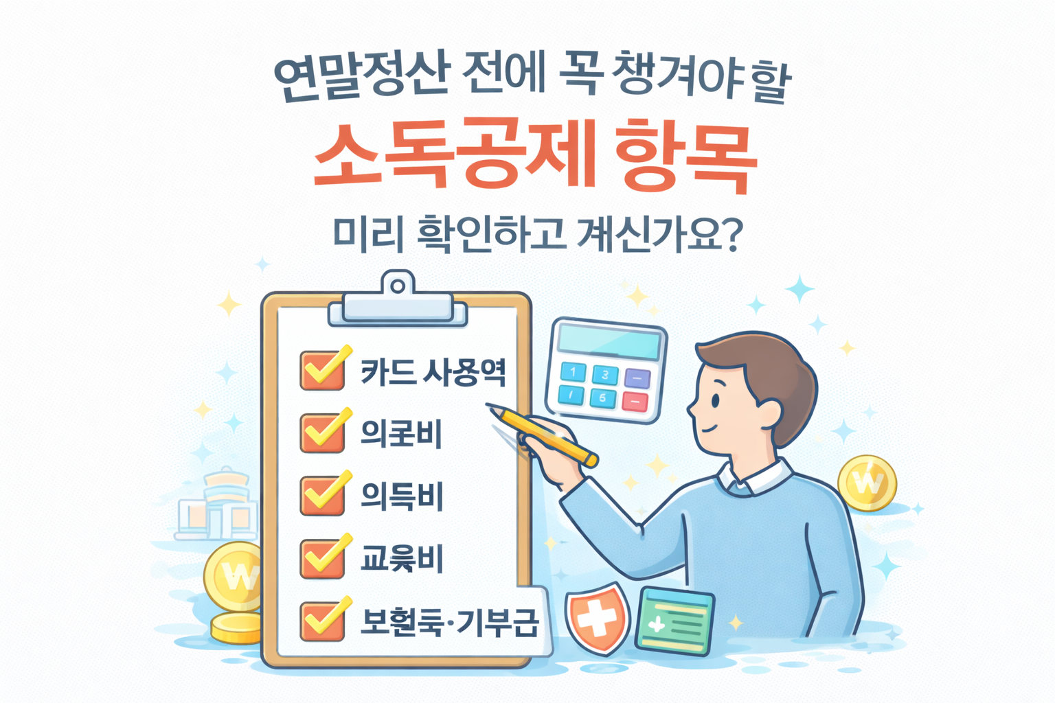 연말정산 #소득공제 #연말정산준비 #세금환급 #직장인절세“연말정산 전에 꼭 챙겨야 할 소득공제 항목, 미리 확인하고 계신가요?”연말정산은 같은 연봉이라도 준비 여부에 따라 수십만 원에서 많게는 백만 원 이상 차이가 나는 절세 이벤트입니다.문제는 많은 사람들이 연말정산 시즌이 시작된 뒤에야 급하게 서류를 찾고, 이미 놓쳐버린 소득공제 항목을 뒤늦게 알게 된다는 점입니다. 연말정산은 시작 전에 준비할수록 돌려받는 금액이 달라집니다. 이 글을 끝까지 읽고 꼭 챙겨보세요.연말정산 준비, 지금 안 하면 손해입니다소득공제 항목 먼저 확인하세요 무료로 확인하러 가기 소득공제란 무엇인가요?소득공제란 세금을 계산하기 전에 과세 대상이 되는 소득 자체를 줄여주는 제도입니다.즉, 같은 연봉이라도 소득공제를 얼마나 잘 챙겼..