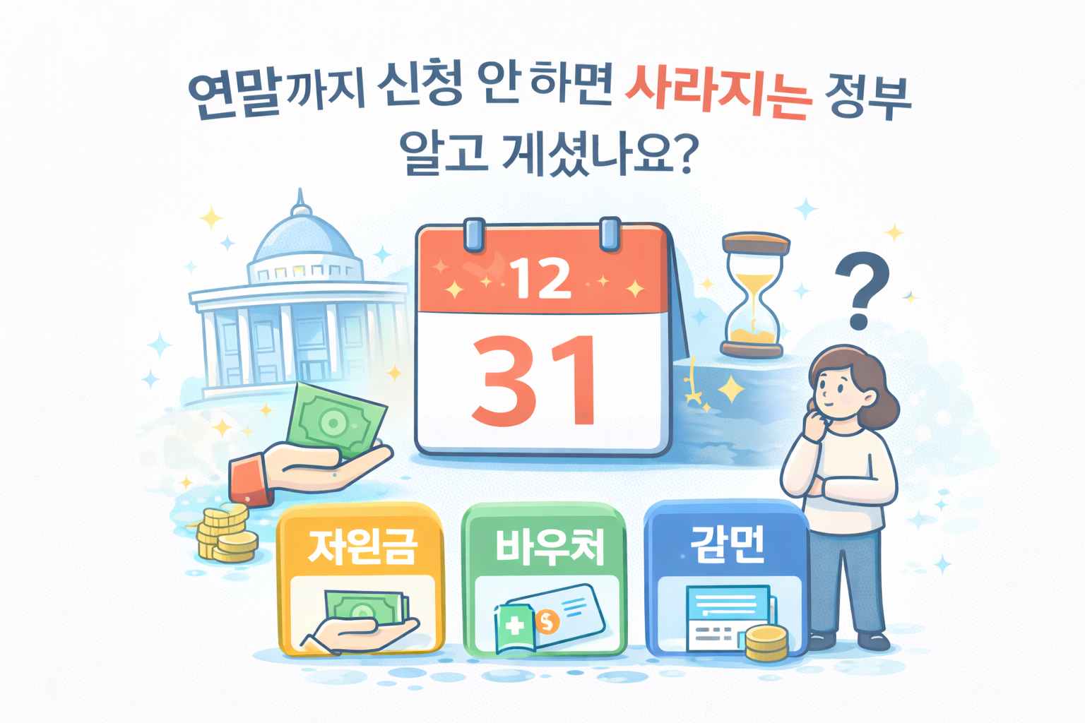 “연말까지 신청 안 하면 사라지는 정부 혜택, 알고 계셨나요?”매년 수많은 정부지원금과 바우처가 신청하지 않았다는 이유만으로 연말에 그대로 소멸됩니다.정부 혜택은 자동으로 지급되지 않는 경우가 많아, 내가 대상자인지조차 모르고 지나치는 일이 흔합니다. 연말이 지나면 다시 받을 수 없는 혜택도 적지 않기 때문에 지금 확인하지 않으면 그대로 손해가 될 수 있습니다. 이 글을 끝까지 읽고 꼭 챙겨보세요.연말까지 신청 안 하면 혜택이 사라집니다정부지원금·바우처 지금 바로 확인하세요 무료로 확인하러 가기 연말까지 신청해야 하는 정부 혜택이란?연말까지 신청해야 하는 정부 혜택은 지원 기간이 연도 단위로 정해진 제도를 말합니다.이런 혜택은 대상자라도 신청하지 않으면 자동으로 지급되지 않으며, 연말 이후에는 예산 ..