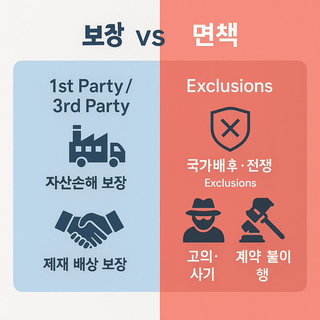 사이버 보험은 해킹, 랜섬웨어, 데이터 유출, 비즈니스 이메일 침해(BEC), DDoS 등 사이버 사고로 인한 재무 손실을 보전하는 특화 보험입니다. 통상적으로 자기손해(1st party)와 대외배상(3rd party)으로 구성됩니다.