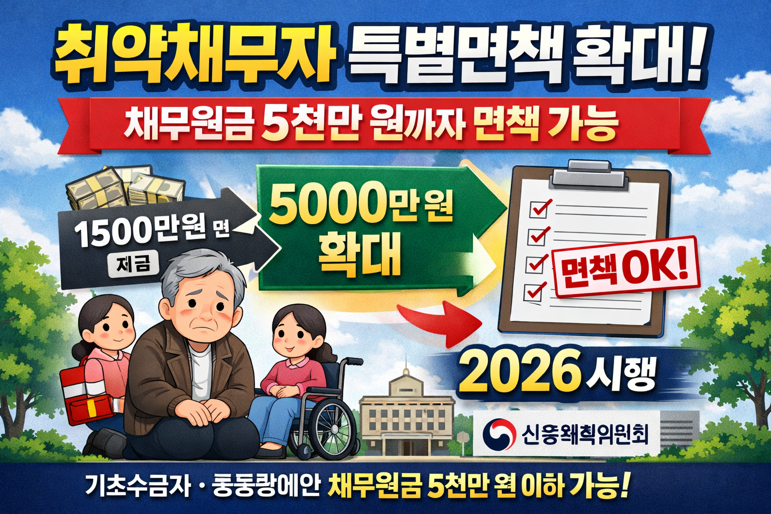 금융위원회는 2026년 1월 30일부터 신용회복위원회의 ‘취약채무자 특별면책’ 대상 채무원금 한도를 기존 1,500만 원 → 5,000만 원으로 대폭 확대한다고 공식 발표했습니다.