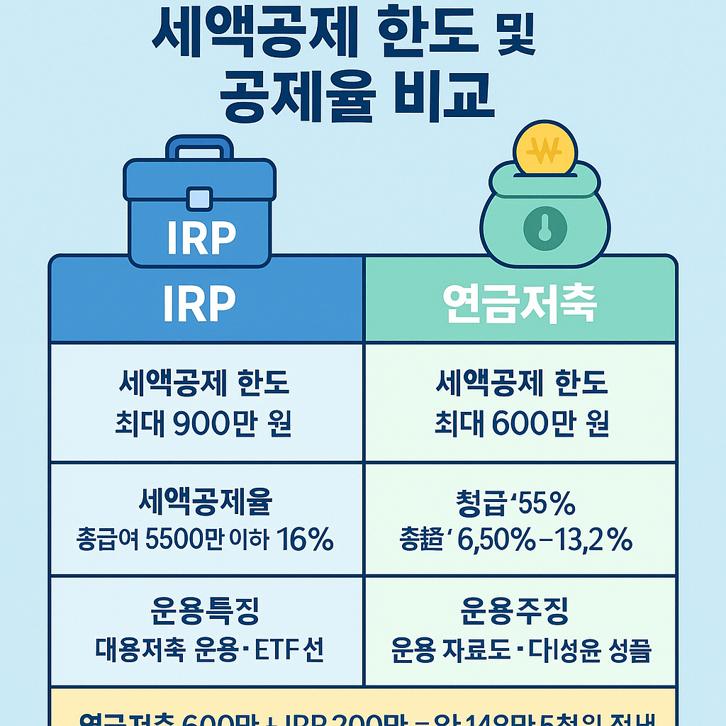 IRP와 연금저축은 모두 세액공제를 받을 수 있는 핵심 절세계좌입니다. 연금저축으로 기본 600만 원 한도를 채우고, IRP를 추가해 최대 900만 원까지 세액공제 혜택을 받는 전략이 2025년에도 가장 효율적입니다. 금융사별 상품조건과 수수료를 비교해 자신에게 맞는 상품을 선택한다면, 세금 절감과 노후 준비 두 가지를 동시에 달성할 수 있습니다.
