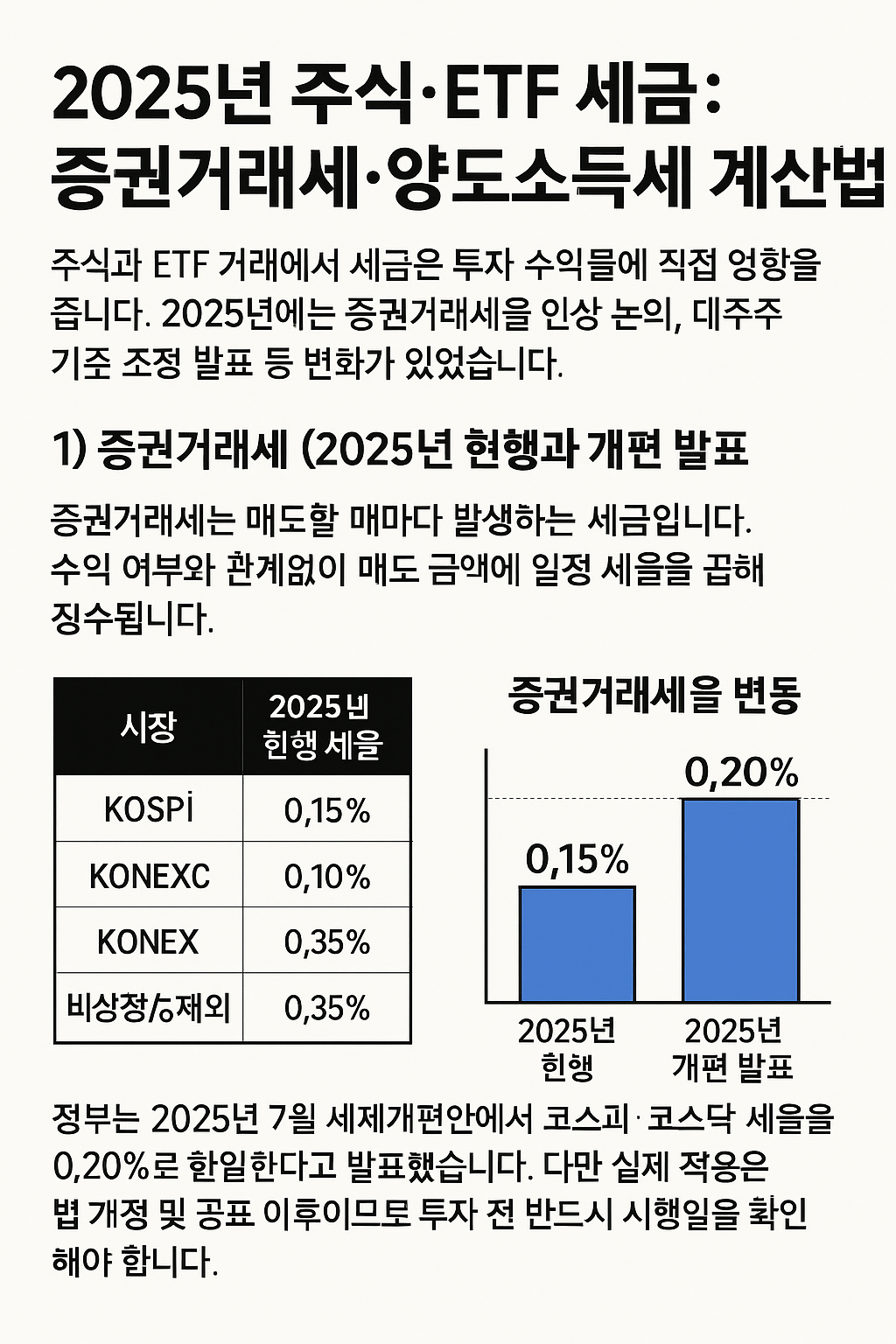 주식과 ETF 거래에서 세금은 투자 수익률에 직접 영향을 줍니다. 2025년에는 증권거래세율 인상 논의, 대주주 기준 조정 발표 등 변화가 있었습니다. 이 글에서는 증권거래세와 양도소득세 최신 계산법을 정리하고, 투자자가 꼭 알아야 할 세금 포인트를 사례와 함께 설명합니다.