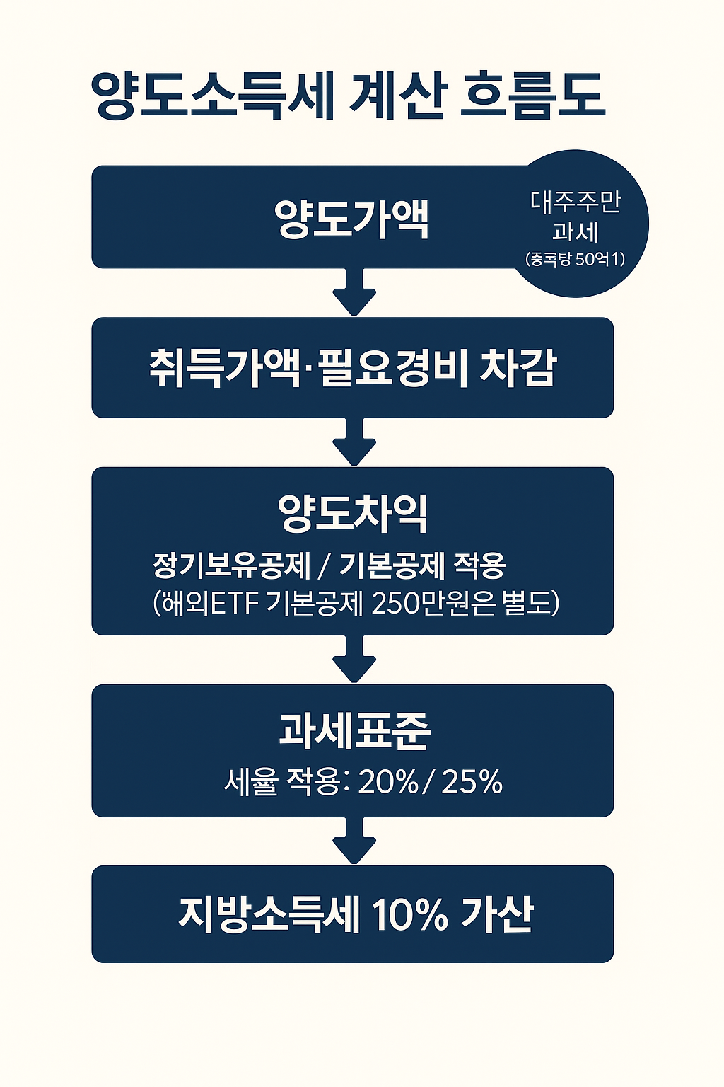 - 신고: 대주주·해외 ETF는 반기별 예정신고 및 확정신고 필수