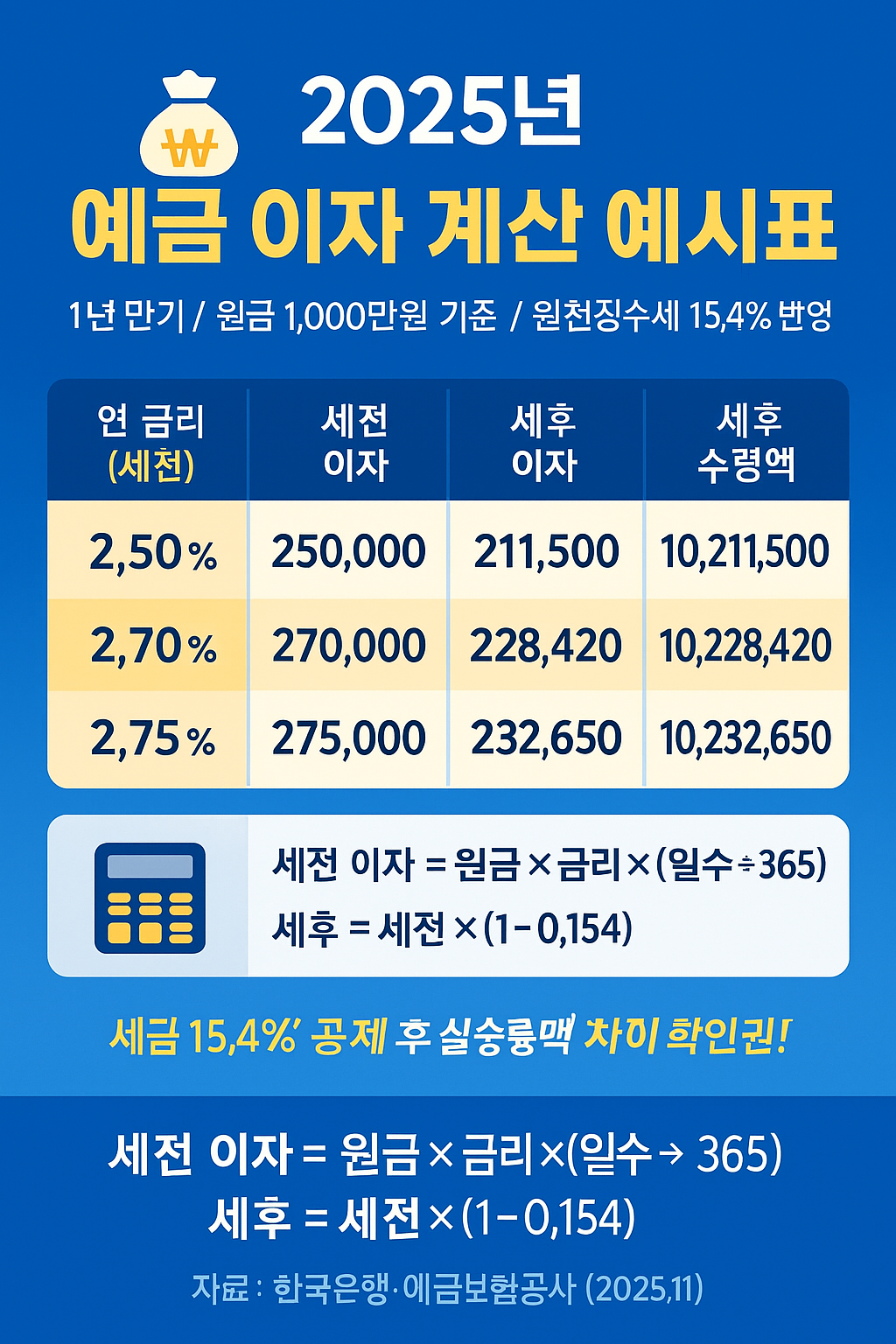 요약: 2025년 11월 기준 한국은행 기준금리 2.50% 유지. 시중 예금 금리는 1년 만기 중심으로 2.5~2.75% 구간 형성 중이며, 우대금리 적용 시 2.7% 내외까지 가능. 인터넷은행(카카오·케이·토스)은 비대면 간편 가입과 실시간 금리 확인이 강점입니다. 세후 수령액은 원천징수세 15.4%를 반영해 계산하세요. (기준: 2025-11-12)