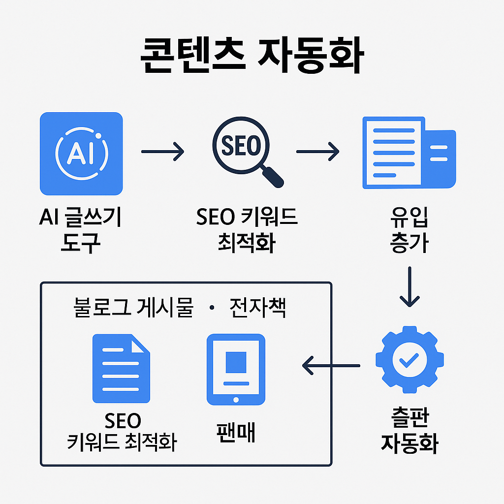 AI 글쓰기 도구로 글을 자동 생성하고, SEO 키워드 최적화를 통해 유입을 늘리는 방식입니다. 전자책 자동화의 경우 AI가 초안을 작성하고, 표지·출판 자동화 시스템으로 빠르게 판매까지 연결할 수 있습니다.