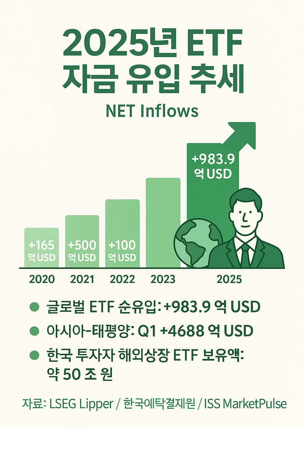 2025년은 인플레이션 완화, 금리 인하 기대, 그리고 AI·친환경산업 성장이라는 세 가지 축이 투자 환경을 주도하고 있습니다. 이에 따라 ETF 시장 규모는 전 세계적으로 12조 달러를 돌파할 전망이며, 특히 테마형 ETF와 배당형 ETF가 강세를 보이고 있습니다.