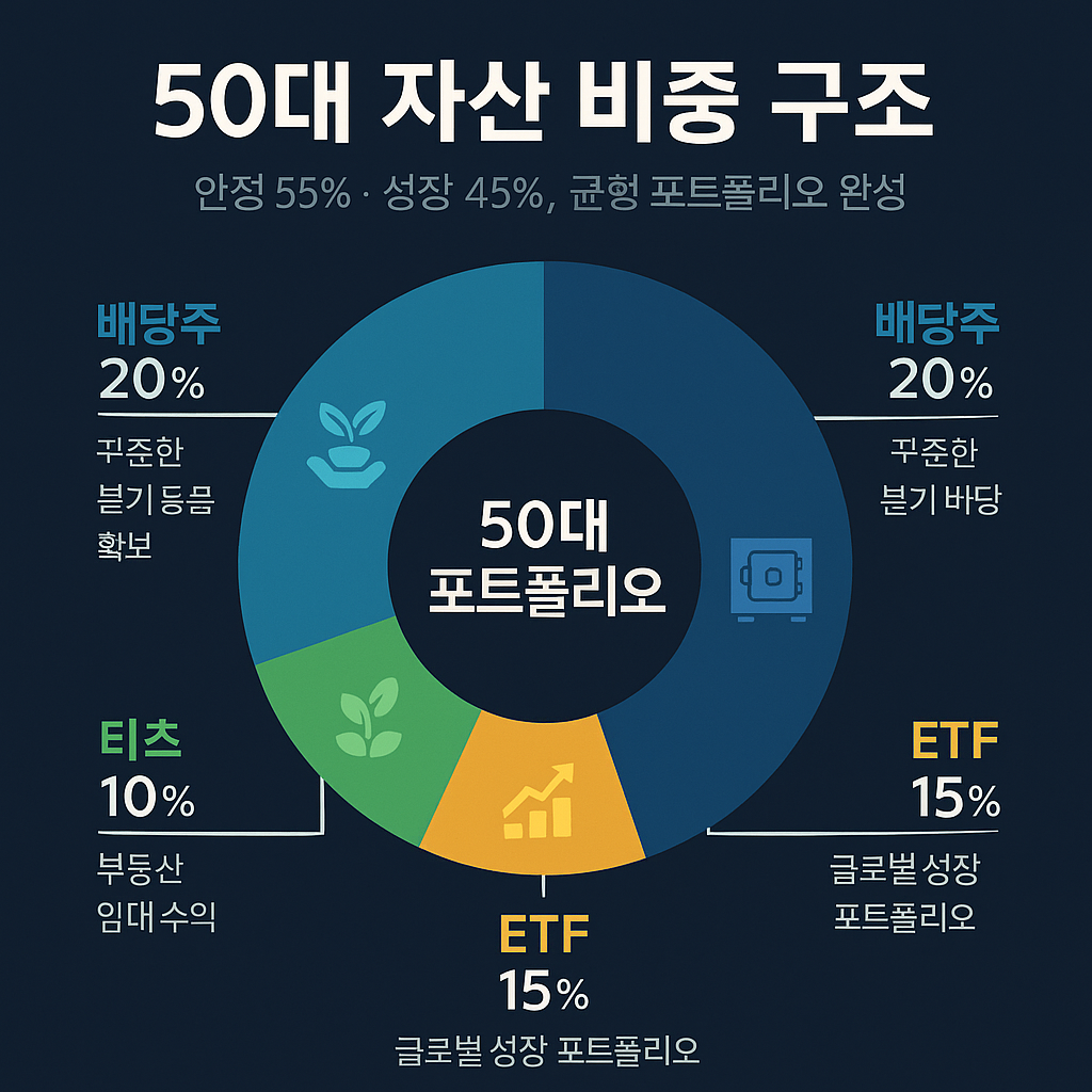 - 자산 배분 예시: 채권·예금 55%, 배당주 20%, 리츠 10%, ETF 15% (50대 보수형 기준).
