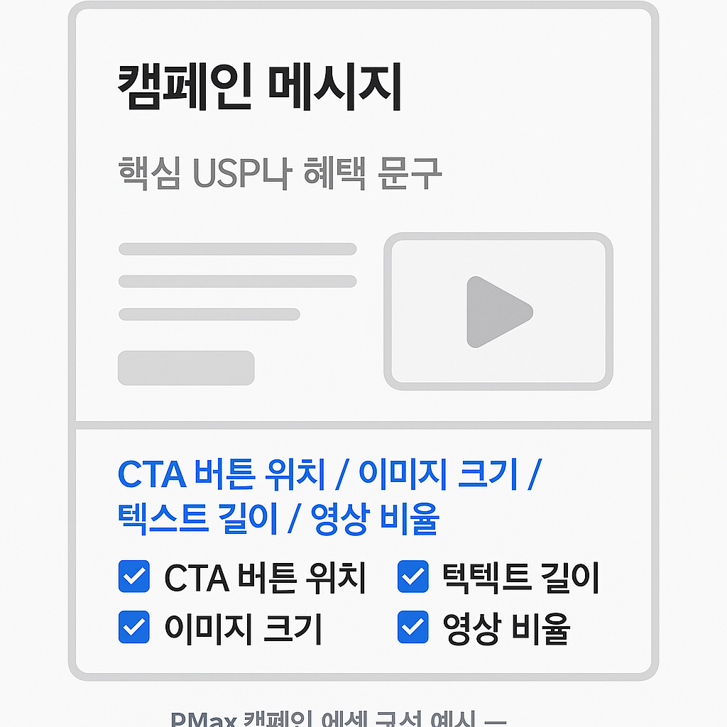 - 에셋 그룹: 주제·타깃별로 헤드라인·설명·이미지·영상 구성, 자동 조합 최적화에 충분한 자산 제공.