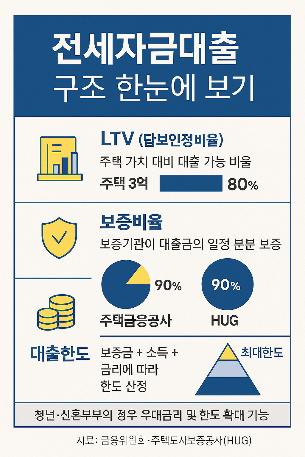 | HUG 전세금안심대출보증 | 80%(청년·신혼 등 90% 유형) | 기관·상품별 내부 한도 적용 | HUG 상품 안내 참조 | 반환보증 연계 요건 유의 |