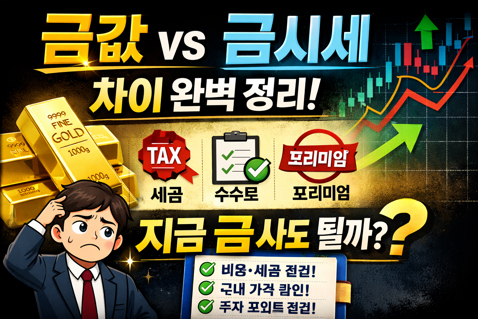 금값 vs 금시세 차이 완벽 정리|지금 금 사도 될까? 수수료·세금·프리미엄까지“지금 금 사도 되나?” 최근 금 가격이 계속 오르면서 이런 고민을 하는 분들이 많아졌습니다. 하지만 이 질문에 제대로 답하려면, 단순히 뉴스에 나오는 금 가격이 아니라 금값과 금시세의 차이부터 정확히 이해해야 합니다.실제로 많은 투자자들이 국제 금시세만 보고 매수했다가, 막상 팔 때 생각보다 수익이 나지 않아 당황합니다. 그 이유는 대부분 수수료·세금·국내 프리미엄을 고려하지 않았기 때문입니다.이 글에서는 금값 vs 금시세 차이를 명확히 정리하고, 지금 금을 사기 전에 반드시 점검해야 할 핵심 포인트를 실전 투자 관점에서 설명합니다.금 투자, 가격만 보고 들어가면 손익이 완전히 달라질 수 있습니다아래 체크리스트부터 먼저 확인..