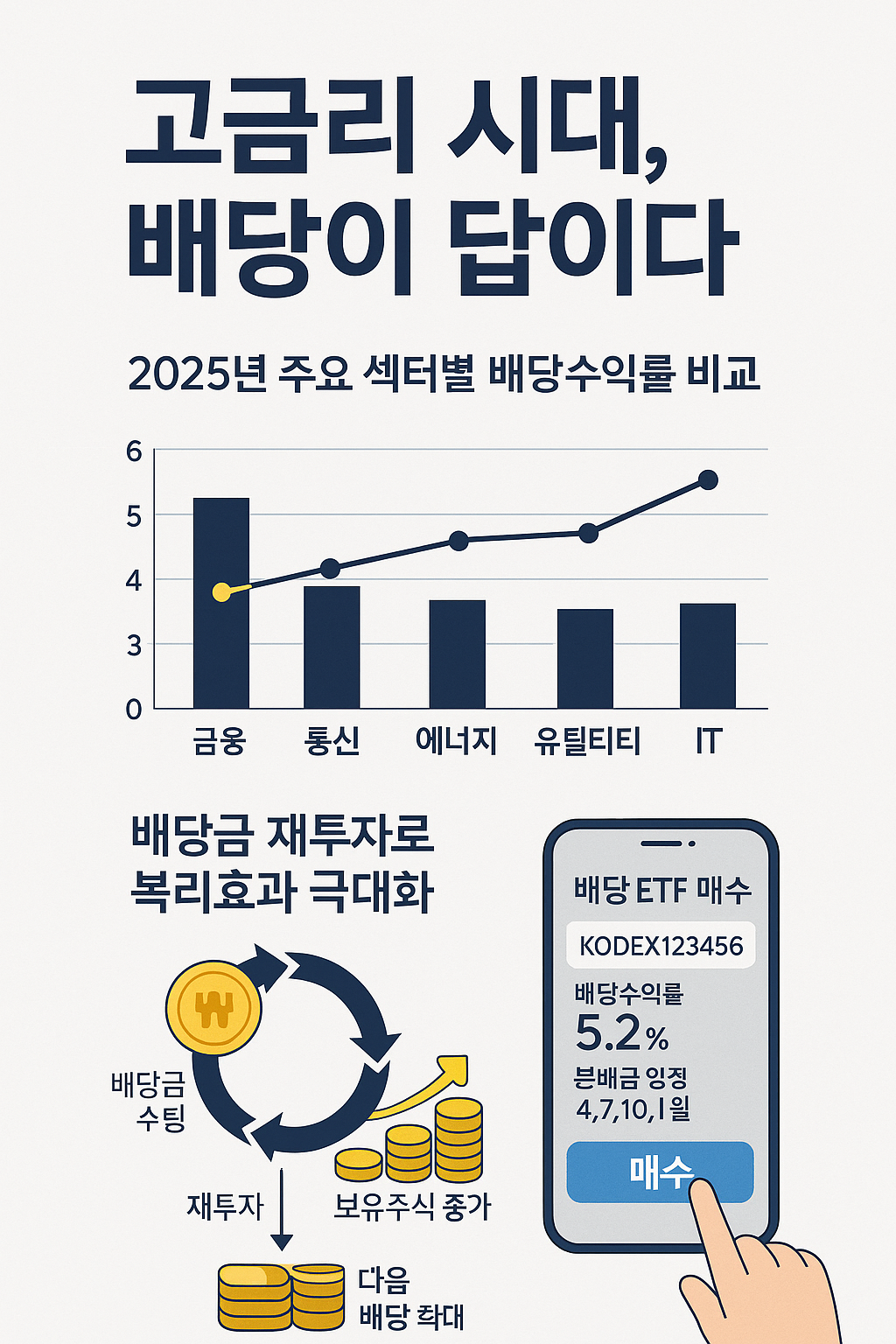 [2025 고금리 시대] 예금 대신 투자할 곳 TOP 5 완전정리키워드: 고금리 시대, 예금 대신 투자, 투자할 곳, 배당주, 리츠, 채권 ETF, 단기채, 금 투자, 달러 자산핵심 요약 2025년 고금리 시대에는 예·적금만으로 물가를 이기기 어렵습니다. 현금흐름이 보이는 자산과 금리 민감도가 낮은 자산을 조합해 위험을 분산하는 것이 핵심입니다.본 글은 개인투자자가 예금 대신 투자 관점에서 접근할 수 있는 다섯 가지 선택지와 실제 실행 단계(계좌·상품·유의점)를 정리했습니다.결론: 투자할 곳은 단일 답이 아니라 포트폴리오의 조합입니다. 배당/임대/이자/원자재/통화 노출을 균형 있게 담으세요. 1) 고배당주·배당 ETF — 현금흐름 중심의 주식 대안고금리 시대에는 부채 부담이 낮고 현금창출력이 높은 기업이..