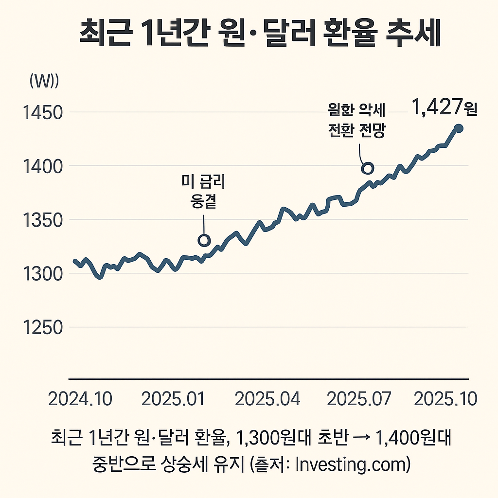 원달러 환율 상승기에 외화 예금으로 수익 내는 전략작성일: 2025-10-17목차왜 원달러 상승이 기회인가?환차익이란? 외화 예금 구조대표 전략 5가지실전 예시 계산주의할 리스크운용 팁 & 체크리스트참고문헌1. 왜 원달러 상승이 기회인가?원·달러 환율이 상승한다는 건, 같은 외화를 원화로 환전할 때 더 많은 원화를 받을 수 있다는 뜻입니다. 즉, 외화 예금에 예치한 달러나 엔화의 가치가 환율 상승만으로도 높아질 수 있습니다.2025년 10월 기준, 달러/원 환율은 약 1,427원 수준입니다. 전문가들은 글로벌 경기 둔화, 미 금리 정책, 원화 약세 등을 이유로 1,450원대 돌파 가능성을 언급합니다. 2. 환차익이란? 외화 예금 구조외화 예금의 수익 구조는 단순히 “이자”뿐 아니라, 환율 변동에 따라 환..