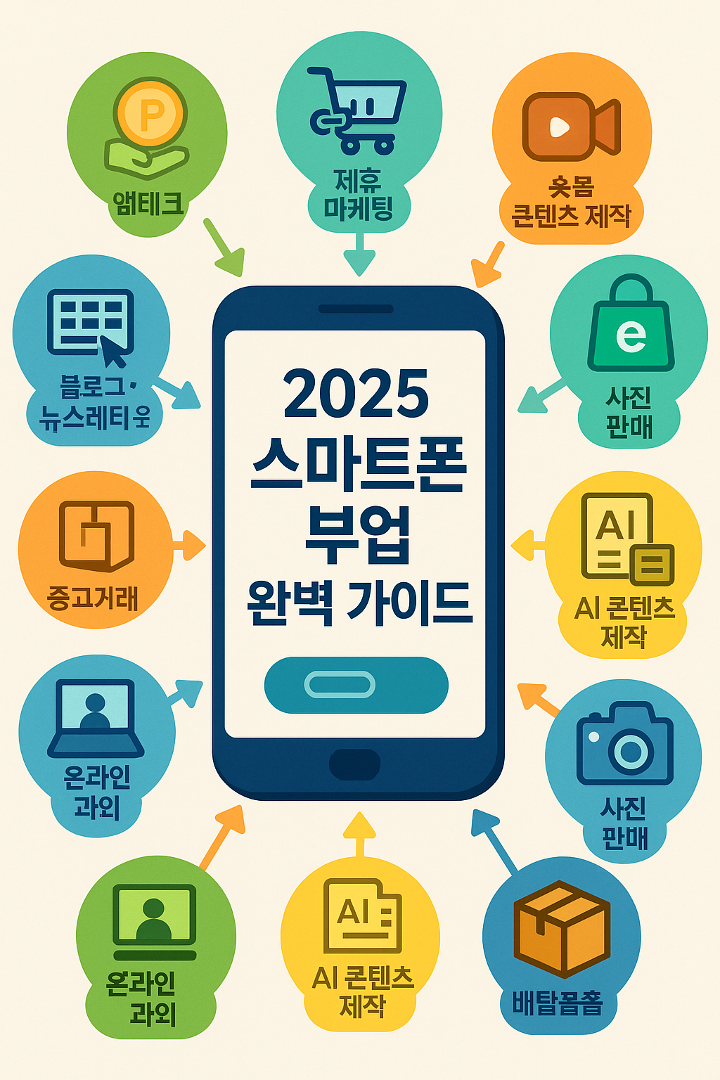 2025년 스마트폰 부업 완벽 가이드2025년 현재, 스마트폰은 단순한 소통 수단이 아니라 언제 어디서든 돈을 벌 수 있는 개인 비즈니스 플랫폼으로 자리 잡았습니다. 앱테크, 제휴 마케팅, 숏폼 콘텐츠 제작부터 AI 자동화, 스마트스토어 운영까지 다양한 기회가 열려 있습니다. 본 글에서는 스마트폰 하나로 가능한 부업 10가지를 체계적으로 정리하며, 실제 실행 팁과 수익화 전략을 함께 소개합니다.목차1. 앱테크 (포인트 적립 & 설문조사)2. 제휴 마케팅 (쿠팡파트너스·애드픽)3. 숏폼 콘텐츠 제작 (틱톡·릴스·유튜브 쇼츠)4. 스마트스토어·Etsy 운영5. 사진·영상 라이선스 판매6. AI 자동화 콘텐츠 제작7. 배달·심부름 플랫폼 알바8. 온라인 과외 및 재능 공유9. 블로그·뉴스레터 운영10. 중고거..