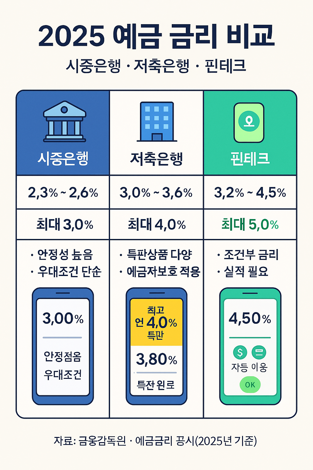 2025년 고금리 예적금 비교: 은행·저축은행·핀테크별 금리 총정리2025년에도 금리 인하 흐름이 본격화되며, 예·적금 금리는 완만하게 하락세를 보이고 있습니다. 그러나 여전히 저축은행과 핀테크 업권에서는 3% 이상 고금리 상품이 다수 유지되고 있습니다. 이 글에서는 은행·저축은행·핀테크별 금리 비교와 함께, 가입 시 알아두어야 할 핵심 포인트를 정리했습니다.목차1. 2025년 예·적금 금리 현황2. 은행 vs 저축은행 vs 핀테크 금리 비교3. 고금리 상품 선택 시 체크포인트4. 주의할 점 및 유의사항5. 결론 및 추천 전략1. 2025년 예·적금 금리 현황한국은행에 따르면 2025년 10월 기준 정기예금 평균금리는 연 2.54%, 적금 평균금리는 연 2.76% 수준입니다. 하지만 금융기관별로는 금리 ..