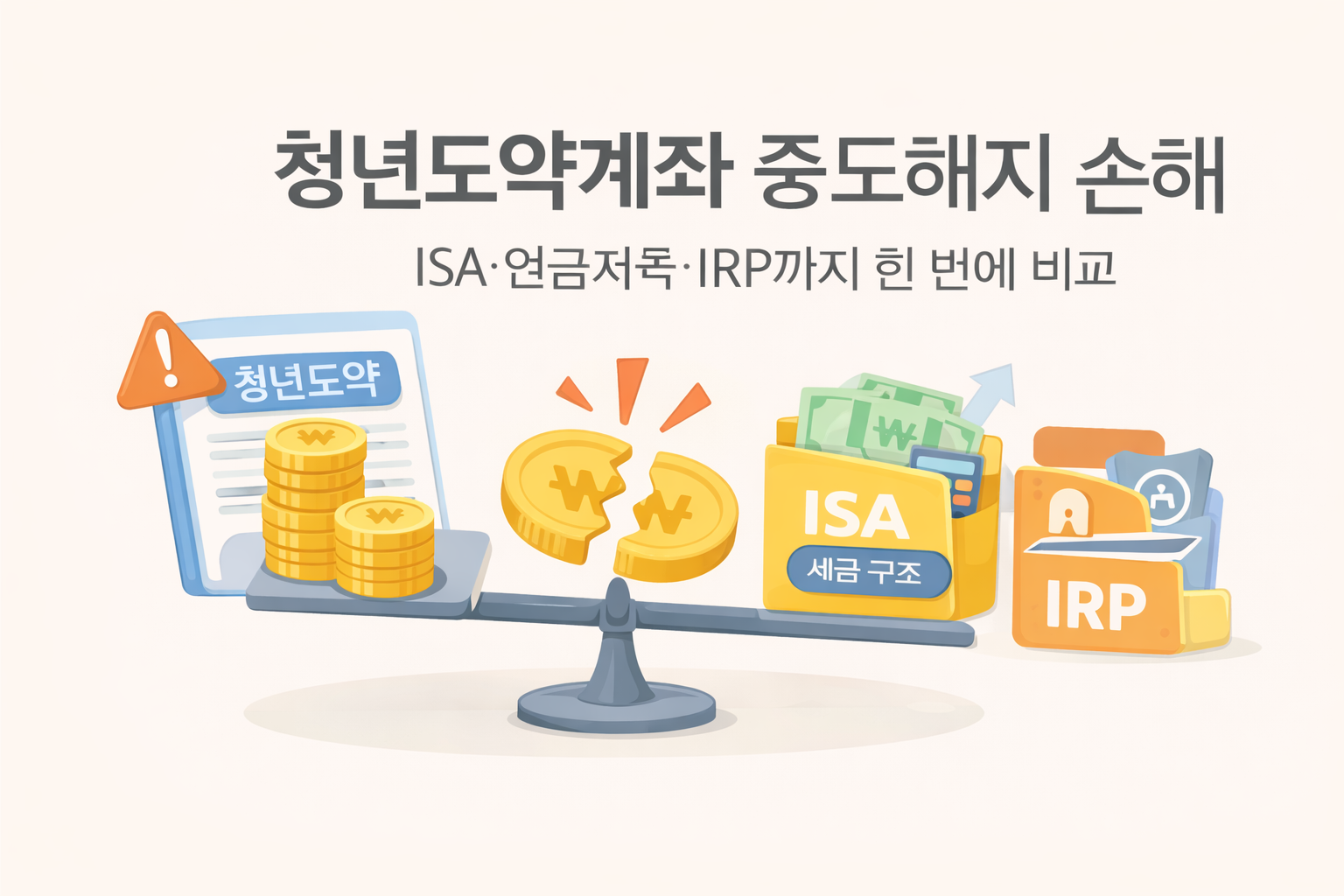 청년도약계좌 중도해지 손해 계산|ISA·연금저축·IRP까지 한 번에 정리청년도약계좌를 알아보다가 가장 많이 멈추는 지점은 딱 하나입니다. “중도해지하면 얼마나 손해 보느냐”입니다.여기에 ISA, 연금저축, IRP까지 함께 비교하다 보면 어느 순간 판단 기준이 흐려지고, 결국 “나중에 다시 보자”로 미뤄지기 쉽습니다.이 글은 그런 혼란을 정리하기 위해 ✔ 청년도약계좌 중도해지 시 손해 구조 ✔ ISA vs 연금저축 vs IRP 목적별 차이 ✔ 은행별 청년도약계좌 선택 기준 을 한 번에 이해할 수 있도록 처음부터 다시 정리한 글입니다. 결론 요약청년도약계좌는 중도해지 손해가 큰 대신 확정 혜택이 강한 계좌이고, ISA·연금저축·IRP는 세금 구조로 수익을 키우는 계좌입니다. 청년도약계좌란 무엇인가?청년도약계..